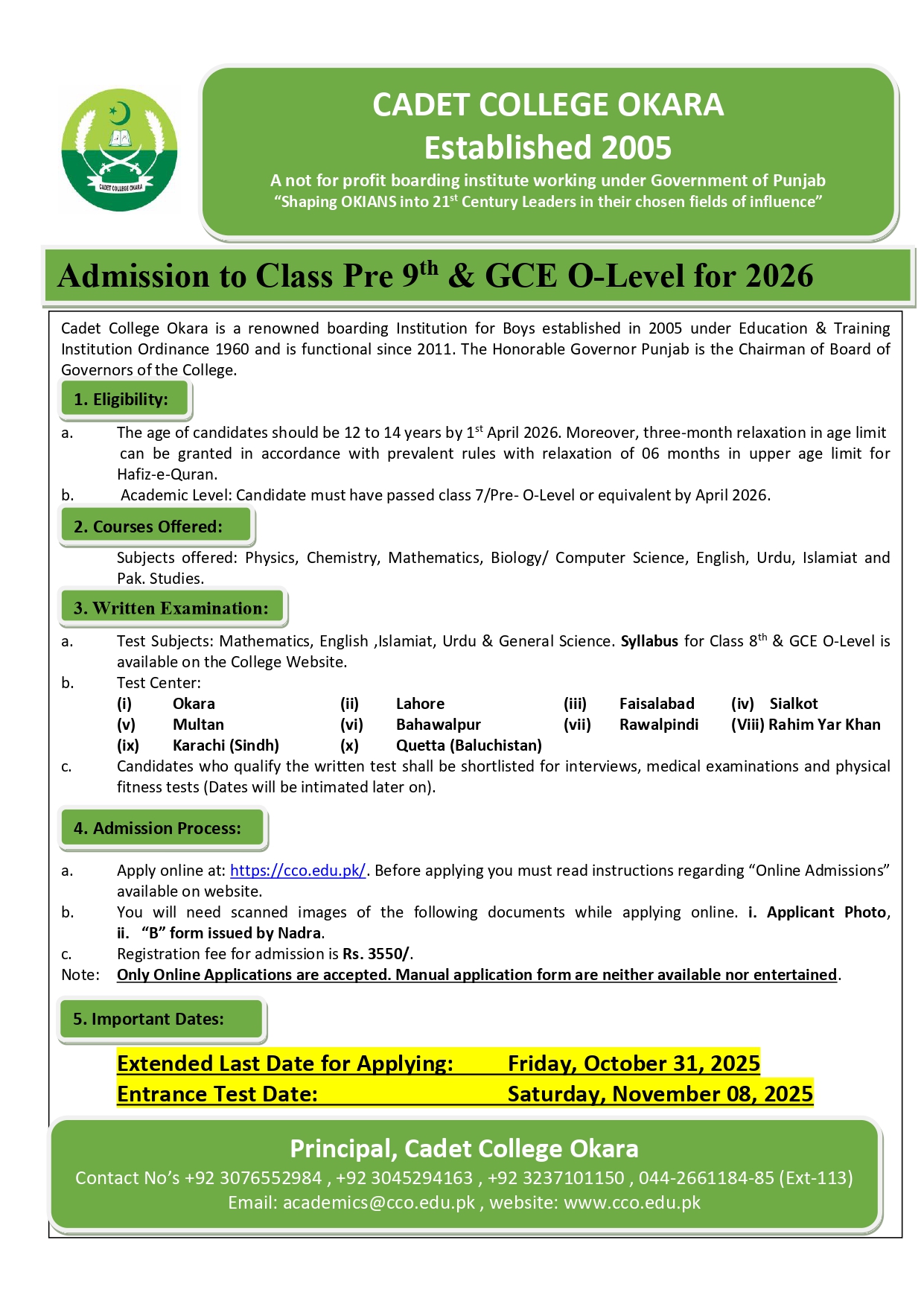 Cadet College Okara aims to produce Global Leaders among the students who are ready to lead the world after graduating from the College. In my opinion, teachers and students should be well-equipped to face the 21st Century Challenges. For that matter, we are deeply indulged in STEM culture and provide a Conducive Learning Environment at the Campus. We believe in providing a reasonably happy lifestyle to the students, employees and their families, so that they may work enthusiastically for the betterment of the institute.