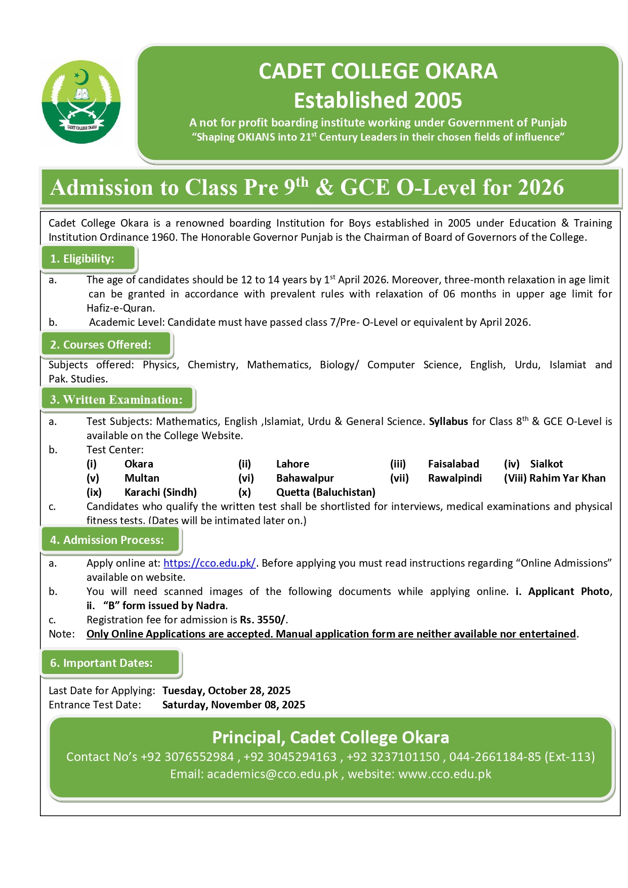 Cadet College Okada, 7 km Off Faisalabad Road Okara